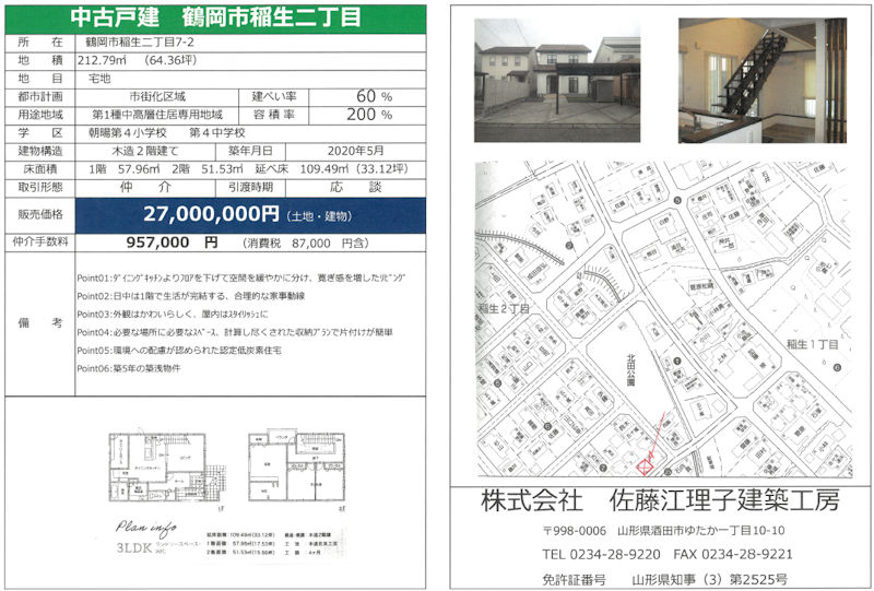 情報更新日:2025/12/16掲載期限日:2025/12/30 佐藤江理子建築工房では、土地、中古住宅の売買・仲介をいたします。 土地・中古住宅を売りたい方、探している方、お気軽にご相談ください。 商談中 [中古戸建]鶴岡市稲生二丁目 拡大PDFを見る 販売中 [売地情報]酒田市緑町 拡大PDFを見る 販売中 [売地情報]酒田市光ケ丘 拡大PDFを見る 販売中 [売地情報]酒田市北千日町 拡大PDFを見る 販売中 [売地情報]酒田市二番町 拡大PDFを見る 販売中 [売地情報]酒田市幸町1丁目 拡大PDFを見る Pckup!ピックアップ 新築向け補助金のご案内 消費税率の引上げに伴う4つの支援策 新生活様式に対応した設備のご案内 Withコロナにマッチした『玄関手洗い』のご提案/衛生的な空間づくり/在宅勤務を快適に! オンライン打ち合わせ 時間や場所にとらわれず、図面や資料を見ながら、スマートフォンやパソコン、タブレットで、家づくりのお打合せができます。