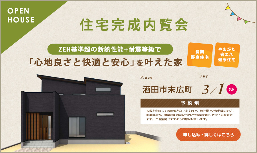 3月1日完成内覧会を開催します。 2026年02月05日 3月1日完成内覧会を開催します。 長期優良住宅 やまがた省エネ健康住宅 『ZEH基準超の断熱性能+耐震等級で「心地良さと快適と安心」を叶えた家』 Pckup!ピックアップ 新築向け補助金のご案内 消費税率の引上げに伴う4つの支援策 新生活様式に対応した設備のご案内 Withコロナにマッチした『玄関手洗い』のご提案/衛生的な空間づくり/在宅勤務を快適に! オンライン打ち合わせ 時間や場所にとらわれず、図面や資料を見ながら、スマートフォンやパソコン、タブレットで、家づくりのお打合せができます。